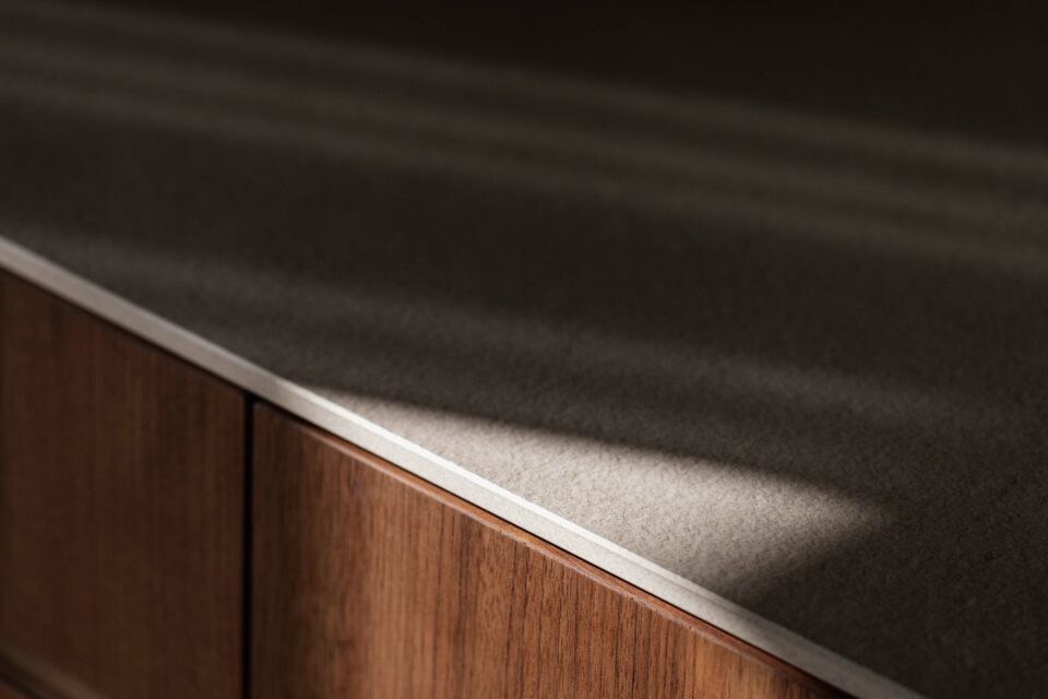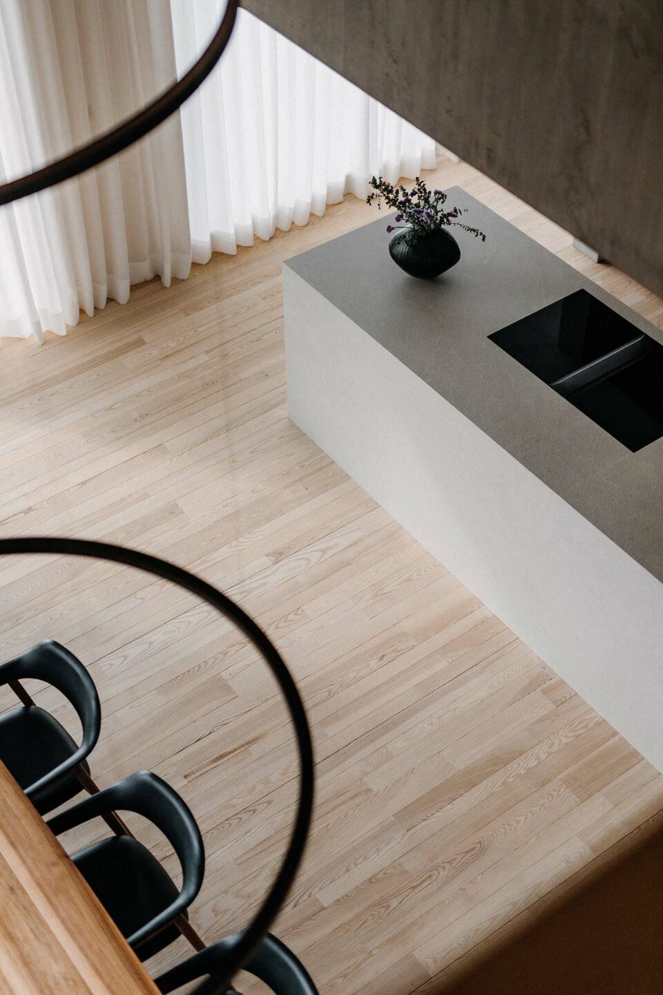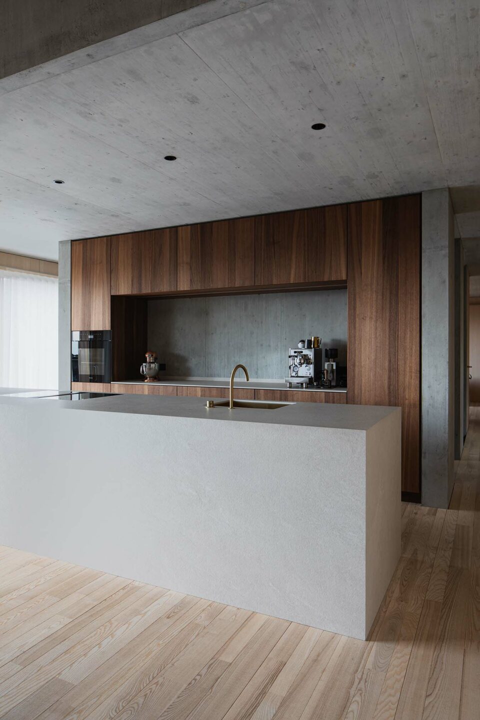Natürliche Materialien wie Holz, Keramik und Beton ergeben einen stilvollen Mix. Die Küche ist das Zentrum des Hauses. Von hier aus geht der Blick in alle Richtungen. Die Keramik-Kücheninsel von Ceraflex ist der Mittelpunkt des Raumes und zieht mit ihrer schlichten Eleganz alle Blicke auf sich. Die helle Keramik findet ihren Gegenpol in dunklen Hochschränken. Design, das Kontrast und Gemütlichkeit verbindet. Keramik: Pacific Blanco