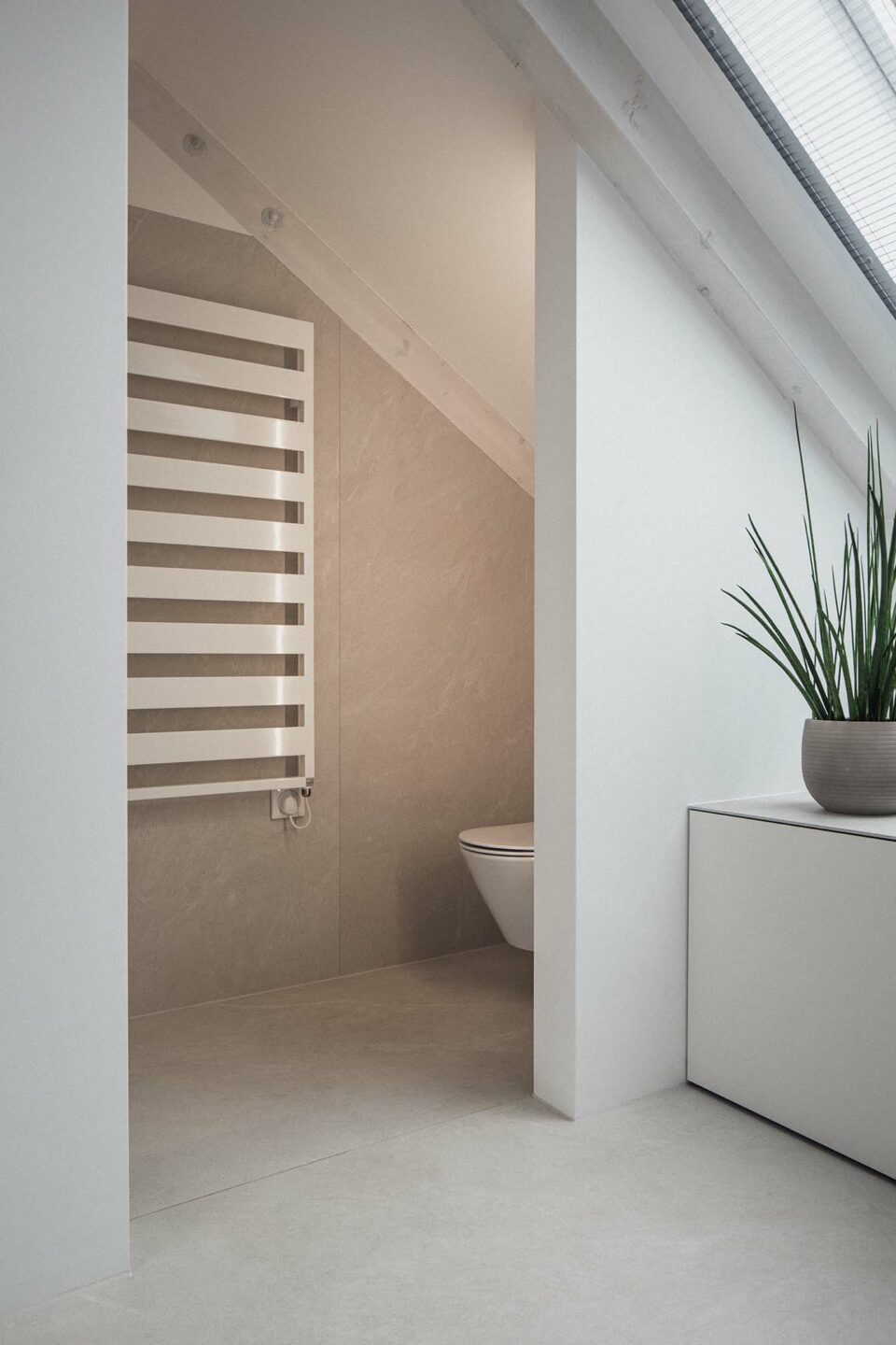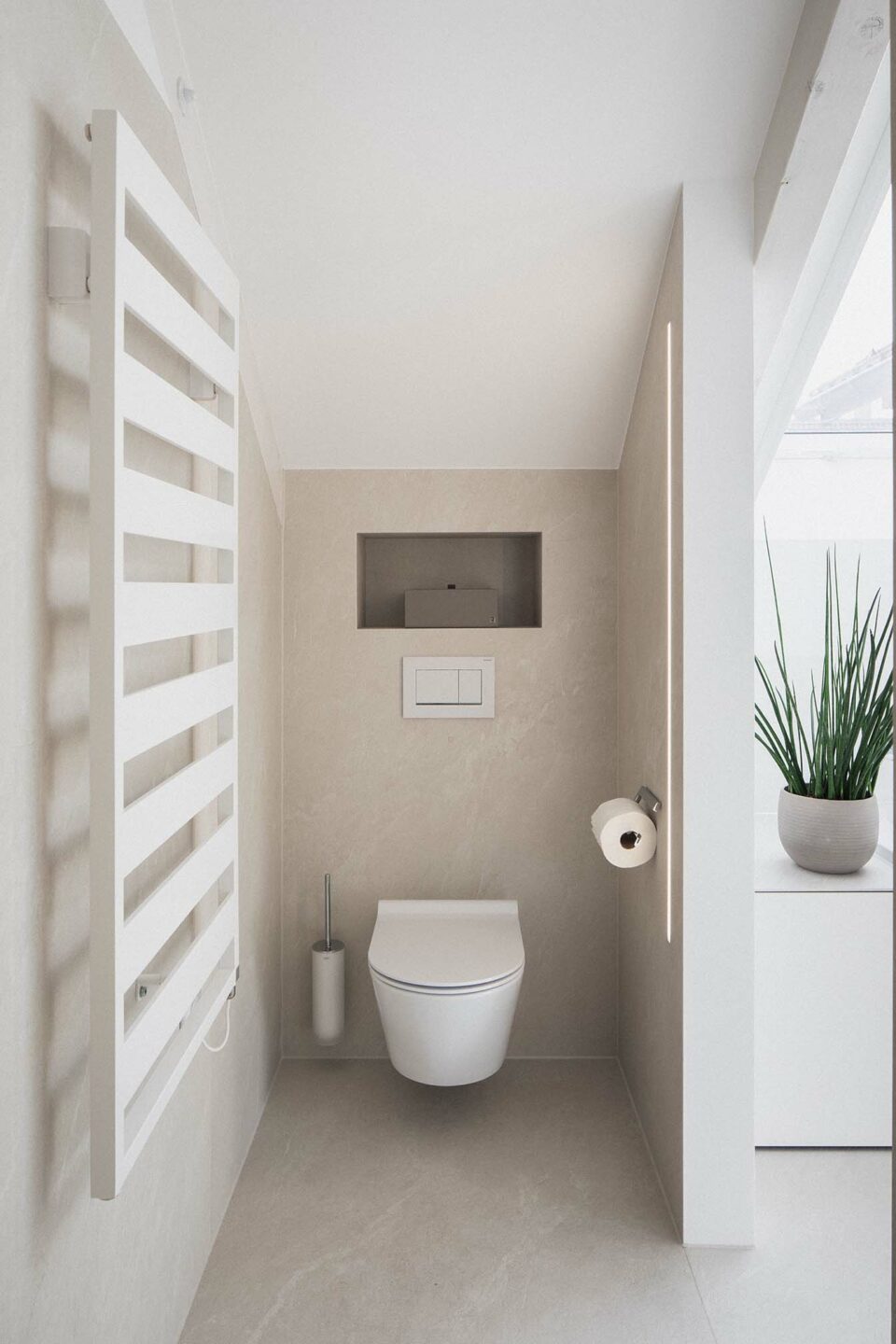 Helle Farben bringen Frische und Leichtigkeit in dieses Badezimmer in Vorarlberg. Das Zusammenspiel verschiedener Keramik-Farben der Wand- und Bodenflächen in Kombination mit heller Einrichtung sorgt für eine belebende Atomsphäre.